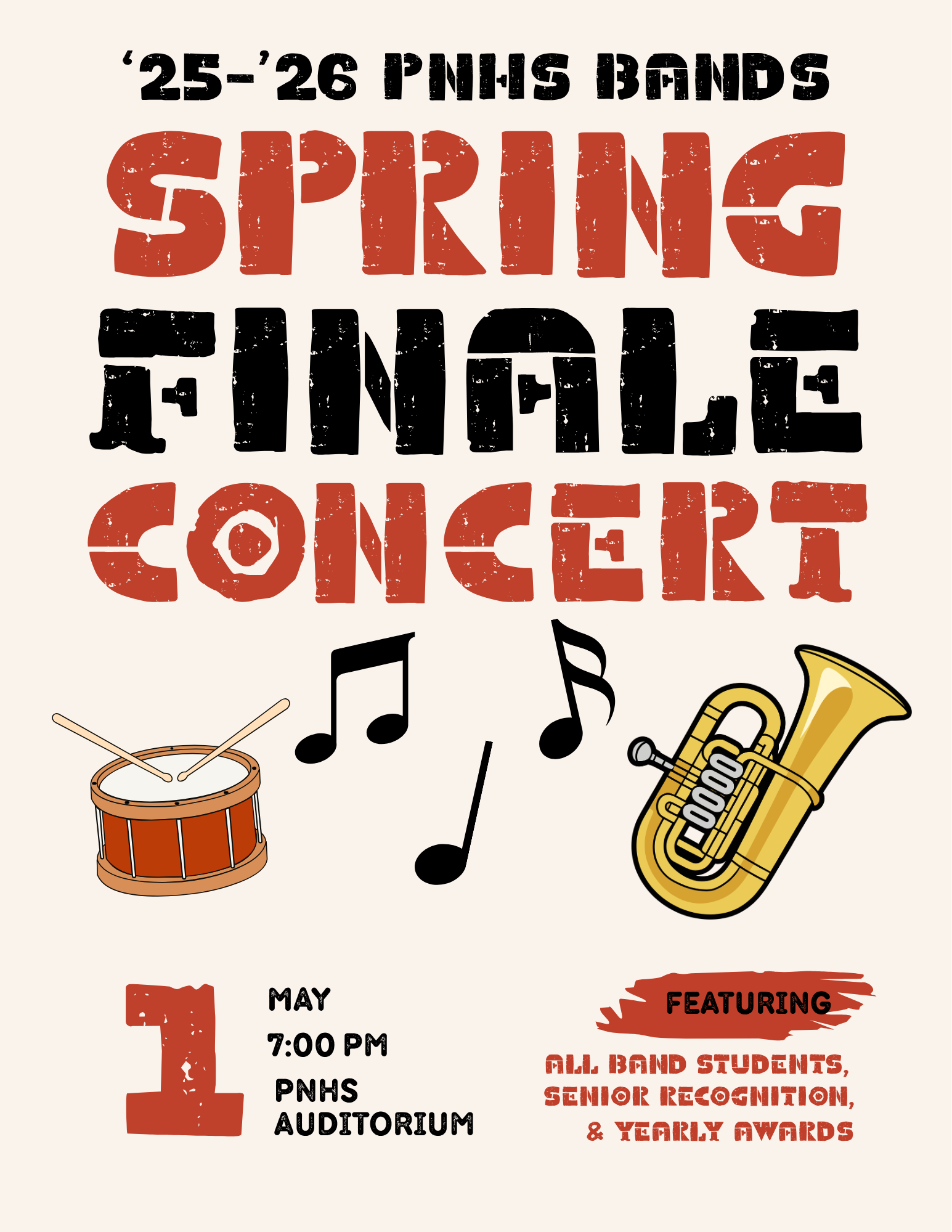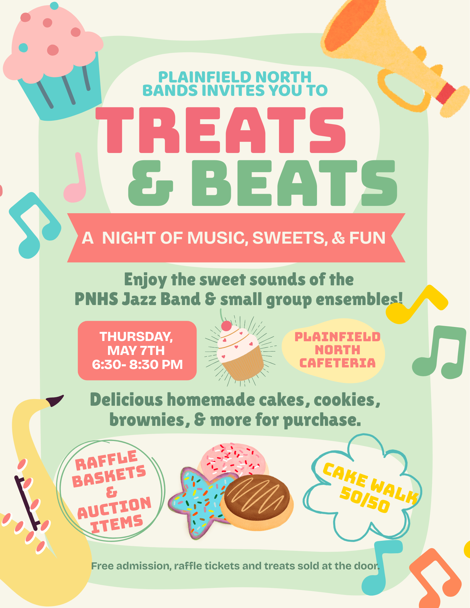 Our annual spring event, Treats and Beats (formerly known as Just Desserts) is quickly approaching - it will be held on Thursday, May 7 from 6:30 to 8:30. The Boosters Board is looking for volunteers to help coordinate the event, specifically a chair/co-chairs to organize the event, volunteers to help with the raffle baskets, and volunteers to help the day of the event. If you are interested in participating, please reach out to Katie Clark at katie.clark@pnhsbands.org. An informational meeting (virtual) will be held in the next week with more information.